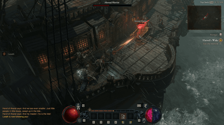 The two of you are interrupted by a Hand of Akarat, who appears to be up to no good, which eventually results in you and Lorath being attacked by monsters from the sea.
