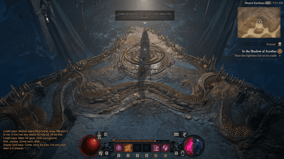 Oracle Cyra requires that you meet her at Mount Karcheus, where the Sightless Eye is to be placed on its cradle to reach deep within your blood to connect with your past enemy.