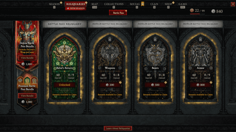 Season 8: Belial’s Return is now live and this season, the new Reliquary System was introduced, providing you with limited yet specific choices for rewards. The Battle Pass has changed, and the current one comes in the form of one of the Reliquaries available during the season. If you are wondering what treasures the Battle … Continue reading Diablo 4 Season 8 All Battle Pass Rewards (Weapons, Beasts & Armor)