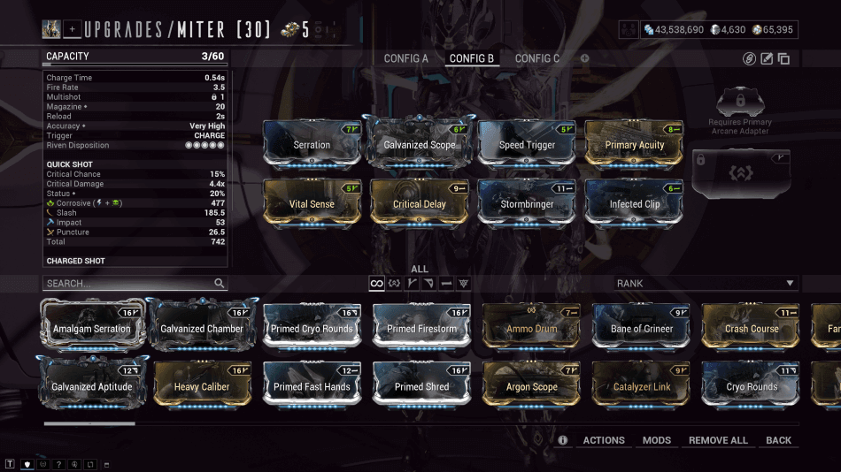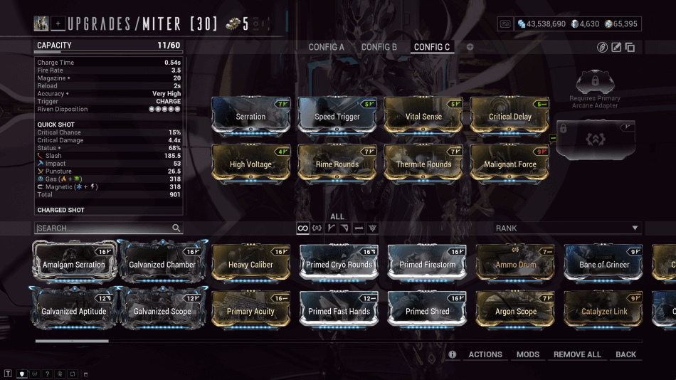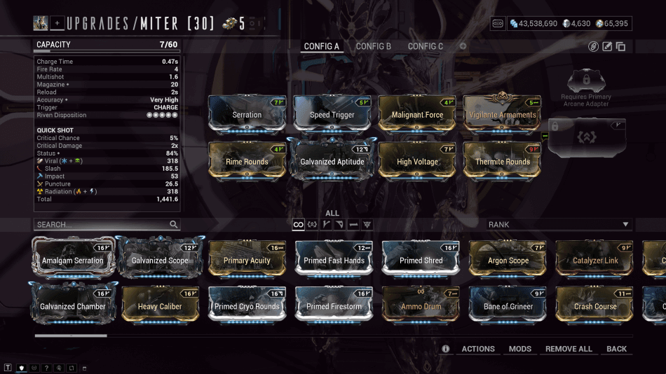 The base Status Chance of the Miter can easily be increased up to 84% or even more depending on what mods you choose to add; thus we added several ones to increase it with this build.